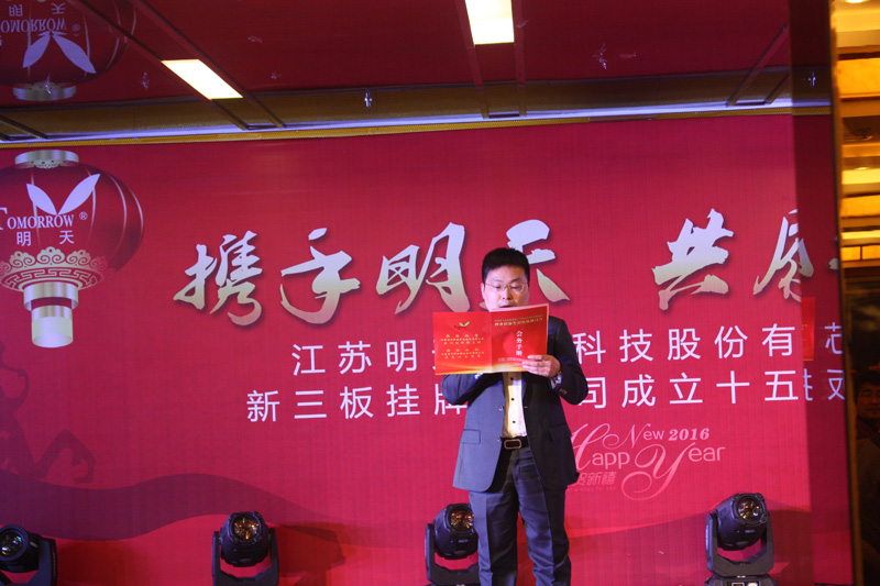 2016年2月2日晚,值此江蘇明天種業(yè)科技股份有限公司新三板掛牌之際,公司在紫金生態(tài)園隆重舉行江蘇明天種業(yè)科技股份有限公司新三板掛牌暨成立十五周年慶典活動。江蘇省農(nóng)科院、南京農(nóng)業(yè)大學(xué)、江蘇省科技廳、江蘇省農(nóng)委相關(guān)領(lǐng)導(dǎo)及公司合作伙伴、老員工代表和全體員工共計350人參加了此次活動。