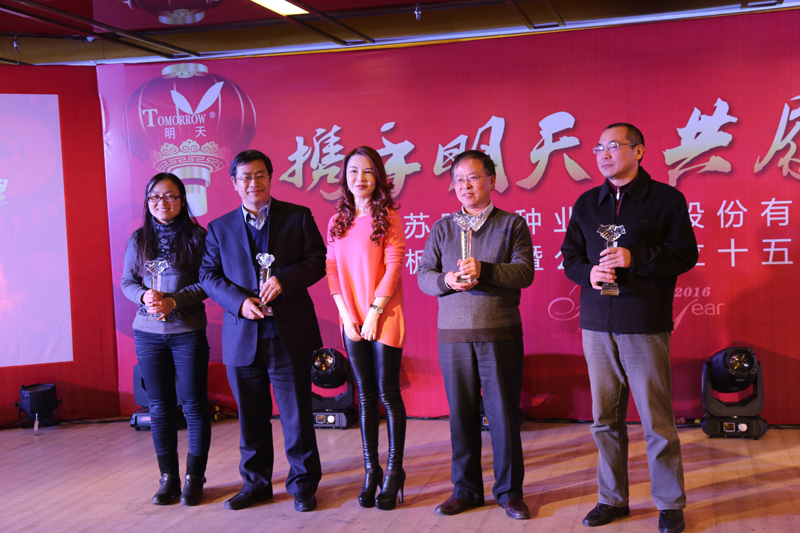 江蘇明天種業(yè)于2001年由江蘇省農(nóng)科院創(chuàng)辦,15年來,明天種業(yè)的發(fā)展,得益于各級領(lǐng)導(dǎo)的大力支持,得益于公司員工的辛勤努力,得益于新老客戶的垂青厚愛!慶典活動上,公司對15年來,一直與我公司攜手同行,經(jīng)歷過荊棘與坎坷,也一起分享成績與榮耀,一直不離不棄的四家單位:羅山明天種業(yè)、江蘇省聯(lián)豐種業(yè)、江蘇姜豐種業(yè)、宣城市宣種種業(yè)有限責(zé)任公司頒發(fā)了“守護之星”獎杯,感謝他們對明天種業(yè)一如既往的支持;對安徽省壽陽種業(yè)、羅山明天種業(yè)、宿遷金田種業(yè)、阜南縣豐悅種業(yè)服務(wù)中心、宣城市宣種種業(yè)、江蘇姜豐種業(yè)、泗洪縣雙豐種業(yè)有限公司、江蘇省聯(lián)豐種業(yè)、海門市興安種子經(jīng)營部、亳州市種子公司、新洋農(nóng)業(yè)試驗站、高郵珠湖種業(yè)、江蘇金色農(nóng)業(yè)、南京神州種業(yè)、建寧縣裕信種子專業(yè)合作社等十五家誠實守信、合作共贏的合作伙伴頒發(fā)了“明天之星”獎杯;對明天種業(yè)十五年來做出杰出貢獻的王才林研究員、盛生蘭研究員、馬鴻翔研究員、顧正中研究員等五位專家頒發(fā)了“特別貢獻獎”;對金楊、楊地龍、徐江、王波、楊海波等五位工作滿十三年以上的老員工頒發(fā)了“奉獻獎”。