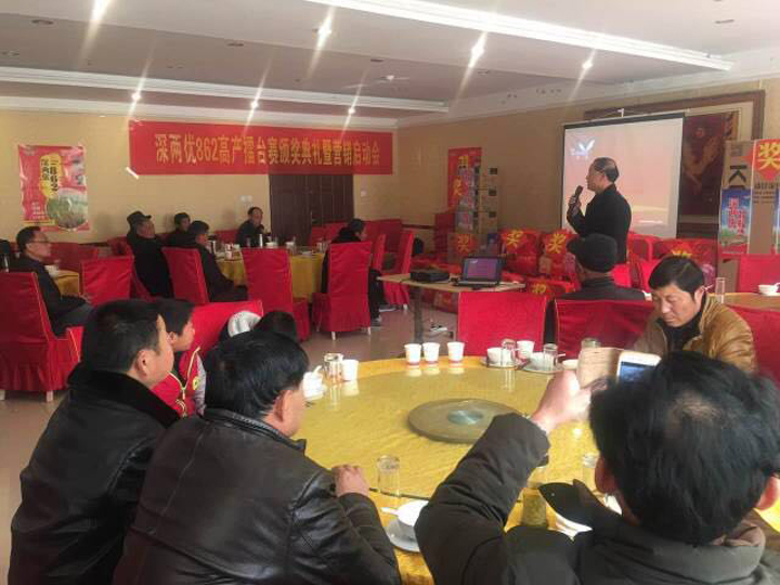 2016年11月10日和11日,江蘇明天種業科技股份有限公司分別在安徽省淮南市和壽縣召開了“深兩優862高產擂臺賽頒獎典禮暨營銷啟動會”。會議議題:總結深兩優862 2016年品種表現、深兩優862品種優勢分析、高產擂臺賽頒獎典禮和下一年度深兩優862高產擂臺賽規則。