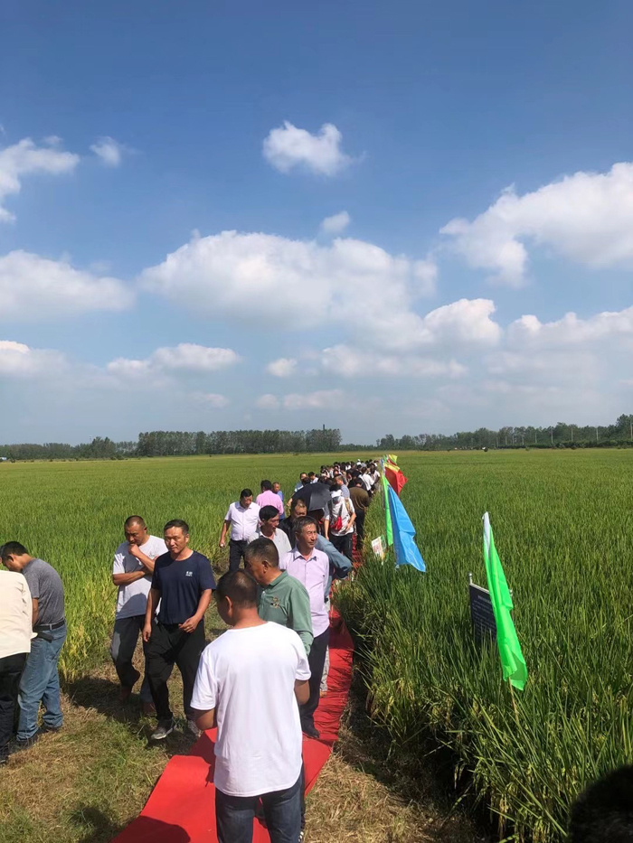 參會(huì)人員共同前往泗陽(yáng)縣穿城鎮(zhèn)大戶種植田間,觀摩明兩優(yōu)絲苗田間長(zhǎng)勢(shì)。遠(yuǎn)遠(yuǎn)看去,明兩優(yōu)絲苗500多畝機(jī)插連片田間金黃一片,豐收在即。田間植株矮壯、穗層整齊、穗數(shù)足、結(jié)實(shí)率高。漫步田間,漫漫稻花香迎面撲來, 全田稈青籽黃、籽粒飽滿。一路之隔的其他品種田間細(xì)條病大爆發(fā)并且田間已出現(xiàn)倒伏,兩相對(duì)比更加突顯出明兩優(yōu)絲苗抗倒性強(qiáng)、抗病性強(qiáng)的優(yōu)勢(shì)。面對(duì)滿眼豐收盛景、喜人長(zhǎng)勢(shì)和突出的抗倒、抗病優(yōu)勢(shì),觀摩人員贊聲不斷,并不時(shí)掏出手機(jī)記錄這一盛況。